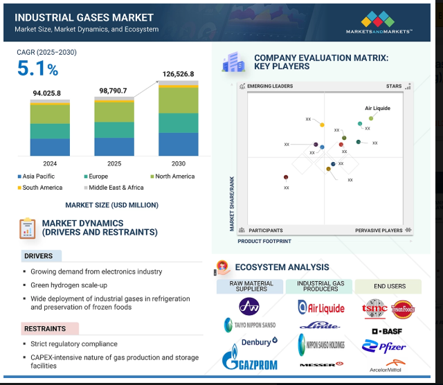 世界の産業ガス市場は、2024年に940億2580万米ドルと評価され、予測期間中のCAGRは5.1%を記録し、2030年には1,265億2680万米ドルに達すると予測されています。工業用ガスは、さまざまな産業および商業用途で使用するために製造・販売されています。生産効率、品質、技術革新の向上に重要な役割を果たすため、多くの分野で不可欠な投入物とみなされています。これらのガスは、圧縮、液化、極低温など、さまざまな形態で供給されます。これらのガスは、安全な操作、汚染の防止、一貫した品質基準の維持を保証するために、特殊な取り扱いおよび供給機器、適切なインフラストラクチャを必要とします。これらのガスは、近代産業の進化において重要な役割を担っています。産業活動を可能にし、サポートし、技術進歩の基盤として機能し、変化し続ける世界経済にとって不可欠な存在であり続けるでしょう。工業化の進展と技術の進歩は、製造・加工分野における高純度ガスの需要とともに、工業用ガスの必要性を高めています。特に、エネルギー、化学、食品加工、インフラ開発などの成長産業において、様々な分野で急速な進歩が見られるようになったことが、工業用ガスの使用の拡大につながりました。また、医療ニーズやエレクトロニクスなどの製造分野における技術向上による需要の増加も寄与しています。エネルギー効率と再生可能資源へのシフト、特に水素用途と環境的にクリーンな製造方法を支持する規制が、世界の産業ガス市場の着実な成長を支え続けています。