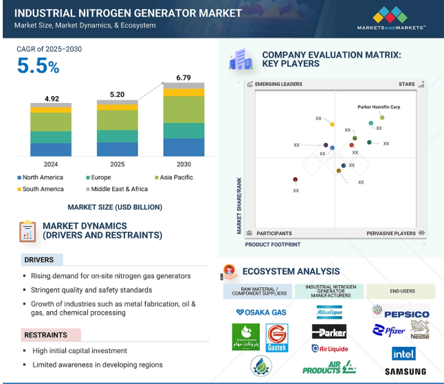 産業用窒素ガス発生装置市場は、予測期間中の年平均成長率5.5%で、2025年の52億米ドルから2030年には67億9000万米ドルに達すると予測されています。費用対効果の高い高純度窒素を必要とする食品包装、電子機器、金属加工、医薬品の需要の増加が、工業用窒素ガス発生器市場の成長を牽引しています。これらのジェネレーターは、オンサイトで窒素を生成し、オンデマンドで、運用コストを削減し、オンサイト窒素生成などの代替戦略を確立するエネルギー効率の高いガスソリューションの必要性に沿っています。さらに、持続可能なソリューションが重視されるようになっています。政府の規制もこの市場で重要な役割を果たしています。米国労働安全衛生局(OSHA)は、作業員を保護するために酸素と窒素の濃度に関する基準を定めています。欧州では、欧州化学物質庁(ECHA)がEU域内のガスに関する厳しい化学物質規制を実施しており、ガス発生器は低リスクのガス調達先として望ましい選択肢となっています。さらに、環境保護庁(EPA)による支援指令は、化石燃料発電機に代わる持続可能な選択肢を促進します。市場の成長は、産業界の脱炭素化に対するインセンティブや、バルクガスの納入を制限するサプライヤーの行動制限にも影響されます。