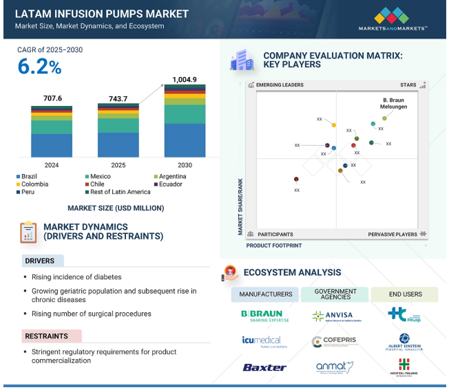 中南米の輸液ポンプの世界市場は、2024年には7億7,060万米ドルでしたが、2025年には7億4,370万米ドルに達し、2025年から2030年にかけて年平均成長率6.2%で堅調に推移し、期間終了時には10億4,490万米ドルに達すると予測されています。ラテンアメリカの輸液ポンプ市場は、同地域全体における医療意識の高まりと先進医療技術へのアクセスの改善により急成長しています。特に農村部や医療サービスが行き届いていない地域での医療インフラへの投資の増加が、輸液ポンプの採用を後押ししています。さらに、低侵襲な治療オプションに対する需要の高まりや、点滴療法を必要とする感染症の流行の増加が主な要因となっています。在宅医療サービスの拡大や個別化医療の嗜好も、市場のさらなる成長要因です。