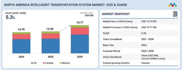 北米の高度交通システム(ITS)市場は、2025年の152億9000万米ドルから2030年までに197億7000万米ドルに達すると予測され、この期間中の年平均成長率(CAGR)は5.3%となる見込みです。市場成長は、都市化の進展、交通渋滞の増加、道路安全と効率的な交通管理ソリューションへの需要拡大によって牽引されています。