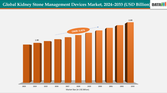 世界の腎臓結石管理装置市場規模は2024年に17億1000万米ドルに達し、18億米ドルの増加を示した。2025年から2033年の予測期間中に年平均成長率(CAGR)5.42%で成長し、2033年までに28億8000万米ドルに達すると予想される。