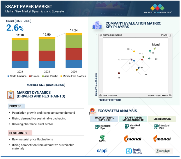 世界のクラフト紙市場は、予測期間中の年平均成長率2.6%で、2025年の125億米ドルから2030年には142億4,000万米ドルに達すると予測されています。予測期間中のクラフト紙市場の成長にはいくつかの要因が寄与すると予想されます。主な要因の1つは、持続可能で環境に優しいパッケージングに対する需要の高まりです。環境保護に対する懸念が高まり、使い捨てプラスチックの規制が実施されるにつれて、産業界は生分解性であるクラフト紙をパッケージングの実行可能な代替品として注目するようになっています。また、オンラインショッピング市場の成長も大きな要因で、包装材や輸送用保護梱包材としてのクラフト紙の需要が高まっています。さらに、食品・飲料部門は、耐久性と純度が不可欠な食料品袋やパウチへの要求を通じて、クラフト紙の使用を促進しています。産業分野でもクラフト紙の使用が増加しており、特にセメント、肥料、化学薬品などを運ぶ工業用袋の製造に使用されています。さらに、便利で軽量な包装に対する消費者の嗜好が高まっており、これが市場の成長をさらに後押ししています。印刷技術や製紙技術の進歩により、クラフト紙はより魅力的で柔軟なものになりました。全体として、持続可能な製造方法へのシフトと産業・消費者両部門からの需要の高まりは、クラフト紙市場の堅調な成長を確実なものにするでしょう。