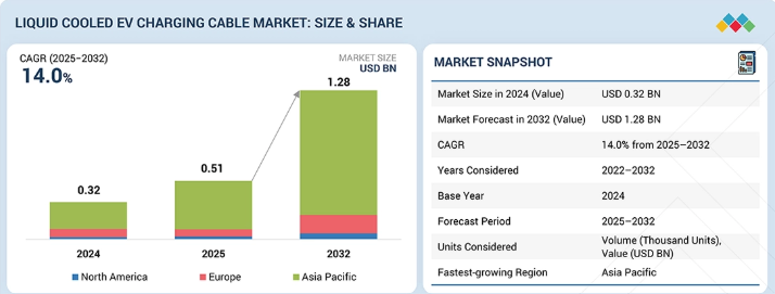 液体冷却式EV充電ケーブル市場は、2025年の5億1000万米ドルから2032年までに12億8000万米ドルへと成長し、年平均成長率(CAGR)は14.0%になると予測されています。この成長は、超高速DC充電への急速な移行によって牽引されており、電流レベルの増加に伴い、空冷式ケーブルは熱的および人間工学的観点から実用的ではなくなっているためです。現在、技術面では明確な移行が進んでおり、150kWから350kWの範囲で持続的な運用を可能にする、統合型液体冷却およびマイクロチャネル設計へと移行しています。これらの進歩により、ケーブルはより小型、軽量、かつ柔軟なものとなっています。さらに、バッテリーパックの大型化や充電受入率の向上といった車両プラットフォームの改善に伴い、充電インフラには定格出力の低下なしに高出力を供給することが求められており、これが液体冷却ケーブルの採用を直接後押ししています。充電ネットワークの経済性もこの傾向に寄与しています。液冷ケーブルは、ステーションの稼働時間、利用率、長期的な信頼性を向上させるだけでなく、コンパクトな高出力充電器の設計にも対応できるからです。より厳格な安全基準、耐久性要件、そして将来さらに高出力化を見据えた設備の必要性が、急速充電ネットワークにおける液冷充電ケーブルの採用を、オプションから標準へとさらに加速させています。