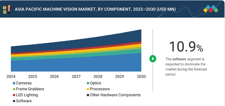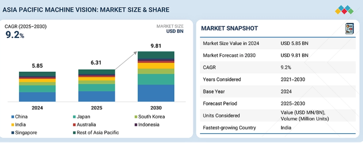アジア太平洋地域のマシンビジョン市場は、2024年の58億5000万米ドルから2030年までに98億1000万米ドルに達すると予測されており、2025年から2030年にかけて年平均成長率(CAGR)9.2%で成長する見込みである。この成長は、同地域における電子機器・半導体製造基盤の拡大、自動車・EV生産における自動化の加速、AI駆動型検査システムの採用増加、ならびにアジア太平洋全域でのスマートファクトリーおよび産業デジタル化イニシアチブへの投資増加によって支えられている。