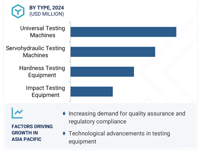 万能試験機(UTM)は、その多用途性と様々な産業にわたる幅広い用途により、材料試験市場を支配しています。これらの試験機は、金属、ポリマー、複合材料、セラミックなどの材料に対して、引張、圧縮、曲げ、せん断などの複数の試験を実施することができます。UTMは、品質管理や製品開発プログラムのために、多くの産業で不可欠なものと考えられています。技術的な観点からは、デジタル制御の導入、自動化オプションの改善、データロギングとコンピュータ化されたデータ解析へのシームレスな接続により、UTMの機能、精度、使いやすさが大幅に向上しています。自動車、航空宇宙、建設などの業界では、材料が必要な強度と安全コンプライアンス基準を満たしていることを確認するため、UTMに大きく依存しています。材料の使用を管理する厳しい規制の導入が増加していることも、UTMへの投資を後押ししています。さらに、新興国における急速な工業化とインフラの成長は、さまざまな材料の評価に柔軟に対応できるUTMベースの試験装置の需要を促進しています。全体として、UTMは、その機能、精度、規制への準拠により、材料試験市場において最大かつ最も急成長しているセグメントです。