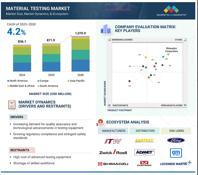 材料試験市場のエコシステムには、メーカー、流通業者、エンドユーザーが含まれます。サプライチェーンは流通業者や小売業者を通じて続いています。材料試験市場は、メーカー、試験所、サービスプロバイダー、規制機関のネットワークで機能し、多くの産業における機器と試験ソリューションのすべての要素で構成されています。この市場は、品質保証とコンプライアンス、技術革新、共同作業による細部への配慮、技術進歩、信頼できる材料特性評価と安全性検証に対する世界的な需要に基づいています。
