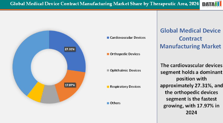 治療領域:2024年時点で、心血管機器セグメントが医療機器受託製造市場を27.31%のシェアで支配している