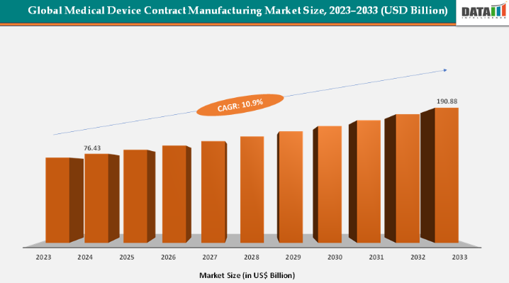 世界の医療機器受託製造市場規模は、2023年の695億4000万米ドルから2024年には764億3000万米ドルに達し、2025年から2033年の予測期間中に年平均成長率(CAGR)10.9%で成長し、2033年までに1908億8000万米ドルに達すると見込まれています。この市場の成長は主に、コスト削減、市場投入期間の短縮、中核的な研究開発活動への集中を図るため、OEMメーカーによるアウトソーシングの増加傾向によって牽引されている。心臓血管用インプラント、整形外科用インプラント、診断機器などの複雑で高精度のデバイスに対する需要の高まりにより、企業は高度な生産能力を持つ専門の受託製造業者に依存するようになった。
