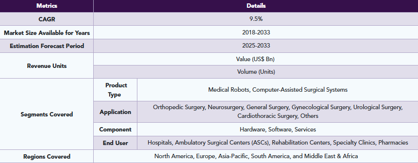 DataM Intelligenceのレポートによると、世界の医療用ロボットおよびコンピュータ支援手術市場は2023年に105億米ドルに達し、2033年までに236億米ドルに達すると予測されています。2025年から2033年の予測期間中は、年平均成長率(CAGR)9.5%で成長すると見込まれています。