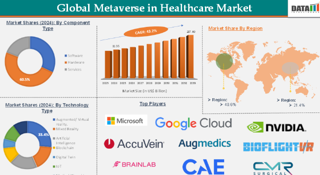 ヘルスケアにおけるメタバースは、拡張現実(AR/VR)、複合現実(MR)、人工知能(AI)、ブロックチェーン、デジタルツイン、IoT、医療用ウェアラブルなどの変革技術によって支えられています。このうち、AR/VR(拡張現実/仮想現実)は、医療トレーニング、疼痛治療、手術計画などに広く採用されていることから、2025年のメタバース世界市場の約34%を占め、現在最大の市場シェアを占めています。