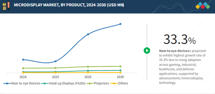 マイクロディスプレイ製品セグメントは、ニアアイデバイス、ヘッドアップディスプレイ(HUD)、プロジェクター、その他(単眼および双眼システム、ライフルスコープ、赤外線サーマルカメラ、医療機器)で構成され、AR/VRデバイス、ウェアラブルエレクトロニクス、カメラ、プロジェクター、医療機器の用途に対応。予測期間中、Near-to-Eyeディスプレイセグメントが最も高いCAGRを記録すると予測されています。