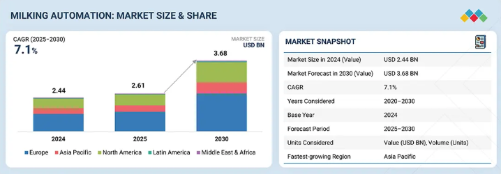 搾乳自動化産業は、2025年の26.1億米ドルから2030年には36.8億米ドルに達し、2025年から2030年までの年平均成長率は7.1%と予測されています。世界市場は、酪農消費量の増加、農業における継続的な労働力不足、あらゆる規模の農場における効率化と動物福祉の向上への要望が拍車をかけ、大幅かつ長期的な成長を遂げています。