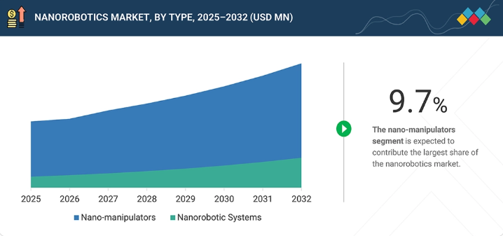 ナノロボティクス市場は、医療、ライフサイエンス、および先端産業研究における採用拡大に牽引され、今後数年間で着実に成長すると予想されています。精密医療、標的薬物送達、および低侵襲診断に対する需要の高まりが、研究機関や企業によるナノロボティクスシステムへの投資を後押ししています。さらに、材料科学、半導体研究、およびナノスケール製造におけるナノロボティクスの利用拡大も、市場の拡大を支えています。