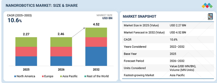 ナノロボティクス市場は、2025年の22億7,000万米ドルから、2032年までに45億2,000万米ドルへと成長すると予測されており、2026年から2032年までの年間平均成長率(CAGR)は10.6%となる見込みです。政府による支援の拡大、ナノロボティクスへの投資、ならびにナノテクノロジーや再生医療への関心の高まりにより、同市場は著しい成長を遂げています。さらに、ナノロボットのナビゲーションやモニタリング機能を強化するAI制御型イメージングシステムの普及拡大も、市場成長の機会をもたらしています。