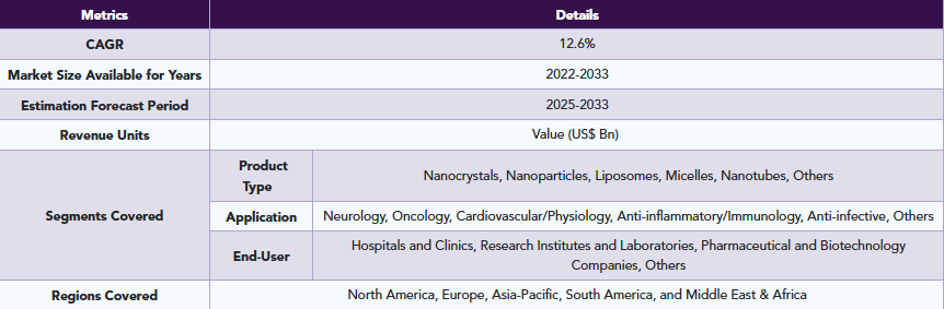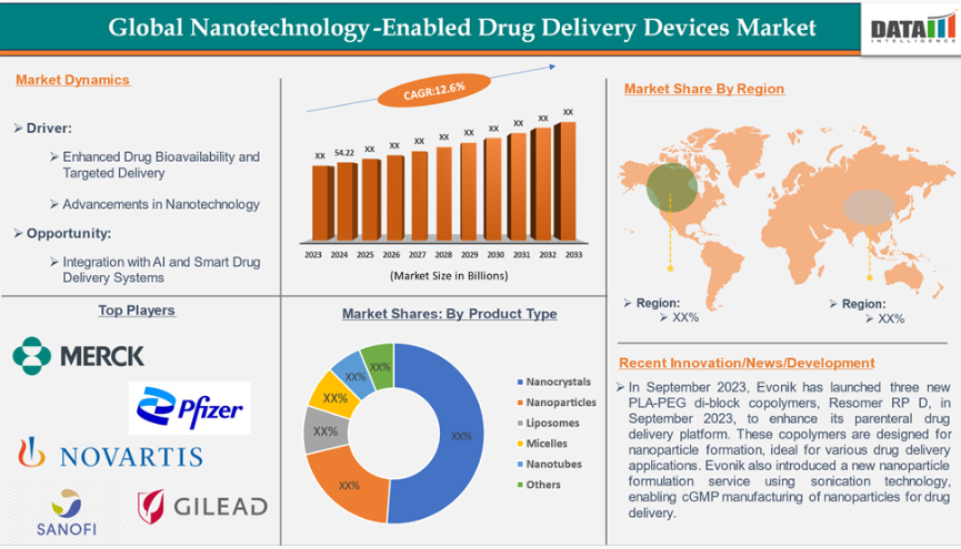 世界のナノテクノロジーを活用した薬物送達デバイス市場は、2024年に542億2,000万米ドルに達し、2033年までに1,791億2,000万米ドルに達すると予測されており、2025年から2033年の予測期間において年平均成長率(CAGR)12.6%で成長すると見込まれています。
