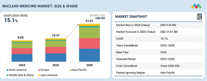 世界の核医学市場は、2024年に90億3000万米ドルと評価され、2025年には104億1000万米ドルに達した。2025年から2030年にかけて堅調な年平均成長率(CAGR)15.1%で拡大し、期間終了時には210億1000万米ドルに達すると予測されている。市場の成長は、がんや心血管疾患の有病率上昇に牽引されており、これにより診断・治療用放射性医薬品および医療用放射性同位元素の需要が加速している。さらに、先進国における放射性同位元素生産プラントや核薬品薬局への投資増加、積極的な償還政策により、核医学ソリューションの認知度が世界的に急速に高まっている。これも市場の成長を促進している。