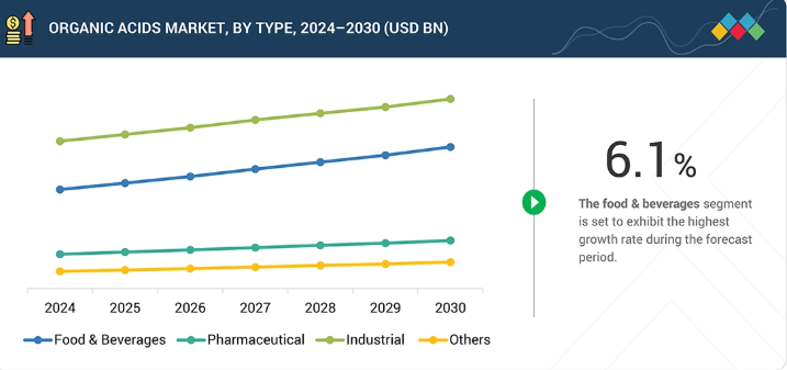 消費者の嗜好変化や業界動向は、食品・飲料・飼料製造企業の事業運営に重大な影響を及ぼします。こうした変化は食品加工業者、飲料メーカー、動物飼料生産者といったエンドユーザーの収益に直接影響します。結果として、エンドユーザーの需要変動は有機酸の消費量、特に保存・風味向上・pH調整用途の需要に影響を与えると予想されます。これはひいては、バリューチェーン全体にわたる有機酸サプライヤーおよび製造業者の総収益に影響を与えます。