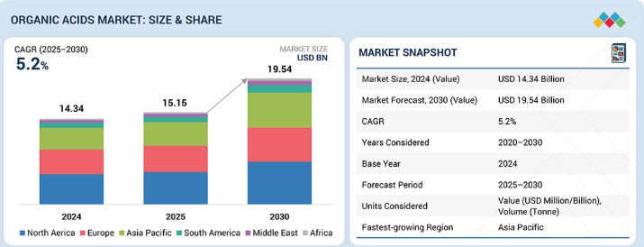 有機酸市場は、2025年の151億5000万米ドルから2030年までに195億4000万米ドルに達すると予測されており、年平均成長率(CAGR)は5.2%となる見込みである。食品・飲料、飼料、医薬品産業における有機酸の需要拡大が市場拡大の主要因である。特にアジア太平洋諸国における天然由来・バイオベース原料の採用増加が、製品の安全性・保存性・栄養価向上用途でのクエン酸、乳酸、ギ酸の利用を大幅に促進している。