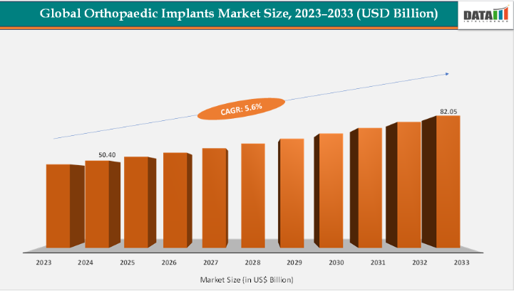 世界の整形外科用インプラント市場規模は、2023年の479億米ドルから2024年には504億米ドルに達し、2025年から2033年の予測期間中に年平均成長率(CAGR)5.6%で成長し、2033年までに820億5000万米ドルに達すると予想されています。整形外科用インプラント市場は、人口動態、臨床的要因、技術革新による持続的な変革を遂げており、現代医療において最も重要な分野の一つとなっている。需要の主な原動力は、変形性関節症、骨粗鬆症、脊椎変形などの筋骨格系疾患の有病率上昇に加え、スポーツ関連損傷や外傷事例(特に発展途上国における交通事故)の増加である。