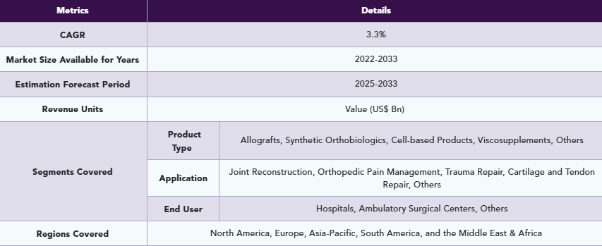 整形外科再生外科製品市場は2024年に45億2,000万米ドルに達し、2025年から2033年の予測期間中に年平均成長率(CAGR)3.3%で成長し、2033年までに60億5,000万米ドルに達すると予想される。