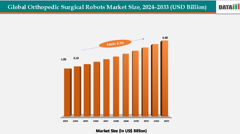 世界の整形外科手術用ロボット市場は、2023年に19億9000万米ドルに達し、2024年には21億8000万米ドルに増加し、2033年までに46億6000万米ドルに達すると予測されています。2025年から2033年の予測期間において、年平均成長率(CAGR)8.7%で成長すると見込まれています。