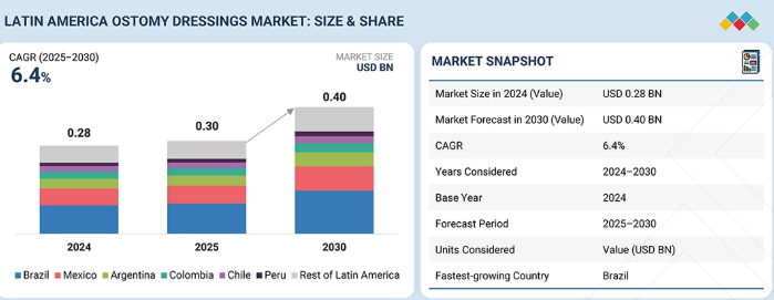ラテンアメリカのストーマ用ドレッシング市場は、2025年の3億米ドルから2030年までに4億米ドルに達すると予測されており、予測期間中の年平均成長率(CAGR)は6.4%と見込まれています。市場成長は、大腸がんおよび膀胱がんの発生率上昇、炎症性腸疾患の有病率増加、長期的なストーマケアを必要とする急速な高齢化人口など、いくつかの主要な要因によって牽引されています。加えて、公的医療保険の適用範囲拡大や外科手術へのアクセス向上により、各地域で実施されるオストミー手術件数が増加しています。さらに、在宅ケアや患者教育の重要性が高まっていること、新たな皮膚バリアやパウチングシステムの普及が進んでいることも相まって、これらの製品の使用拡大に寄与しています。