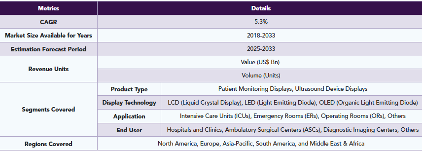 DataM Intelligenceのレポートによると、世界の患者モニタリングおよび超音波診断装置用ディスプレイ市場は、2023年に55億米ドルに達し、2033年までに93億3,000万米ドルに達すると予測されています。2025年から2033年の予測期間において、年平均成長率(CAGR)5.3%で成長すると見込まれています。