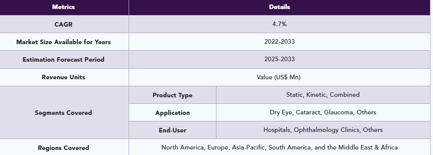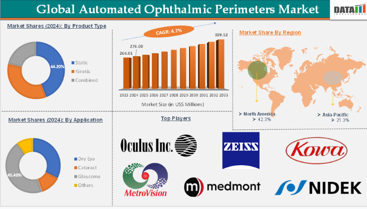 DMIの分析によると、世界の自動眼科視野計市場は2023年に2億6601万米ドルと評価された。市場規模は2024年に2億7600万米ドルに達し、2025年から2033年の予測期間中に年平均成長率(CAGR)5.6%で成長し、2033年までに3億8952万米ドルに達すると見込まれています。