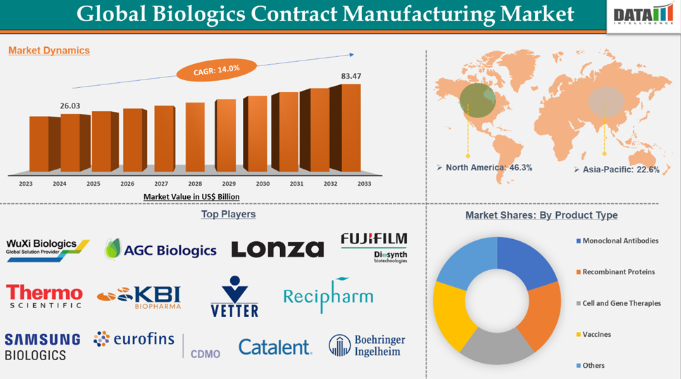 生物製剤の受託製造市場は、生物製剤に対する需要の高まり、生物製剤企業やバイオテクノロジー企業による生物製剤の研究開発費の増加、生物製剤・バイオテクノロジー企業と受託製造企業との戦略的提携などを背景に大きく成長しています。北米地域は、主要プレイヤーの強い存在感とバイオファーマ/バイオテクノロジー企業との戦略的提携により、引き続き優位を保っています。アジア太平洋地域は、バイオ製薬企業による生物学的製剤開発への投資の増加により、最も高いCAGRで成長すると予想され、アンメットニーズの高い患者へのアクセスを提供します。