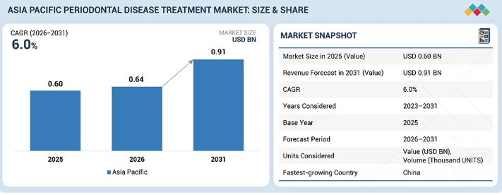 アジア太平洋地域の腹膜透析市場は、2025年に6億米ドルと評価され、2026年には6億4000万米ドルに達し、2026年から2031年にかけて6.0%という堅調なCAGRで成長し、期間終了時には9億1000万米ドルに達すると予測されています。アジア太平洋地域の歯周病治療は、歯科診療における歯肉関連疾患の診断、治療、長期管理を支援するために設計された幅広い技術とソリューションを包含する。これには、スケーリング・ルートプレーニング器具、超音波スケーラー、歯周病用レーザー、外科用機器などの治療ツールと、歯周病プローブ、デジタル歯科画像システム、口腔内スキャナーなどの診断技術が含まれる。臨床要件に応じて、歯周治療ソリューションは非外科的治療で使用される日常的な器具から、複雑な歯周処置を可能にする先進的な再生医療・外科システムまで多岐にわたる。これらの製品はアジア太平洋地域の歯科病院、歯周病専門クリニック、一般歯科診療において重要な役割を果たし、効果的な疾患管理、臨床成果の向上、高水準の患者ケアを支えている。