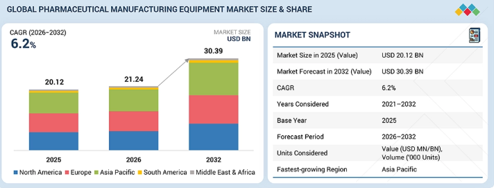 世界の医薬品製造装置市場は、2026年に212億4,000万米ドル、2032年には303億9,000万米ドルに達すると予測され、予測期間中の年平均成長率(CAGR)は6.2%となる見込みです。医薬品製造装置の需要は、ジェネリック医薬品および生物学的製剤の生産増加、医薬品研究開発(R&D)への投資拡大、ならびに世界的な製造施設の拡張によって牽引されています。規制順守、品質保証、プロセス自動化への注目の高まりが、市場の成長をさらに後押ししております。加えて、連続製造やシングルユースシステムといった先進技術の採用により、運用効率が向上し、製薬生産現場全体での設備更新が加速しております。
