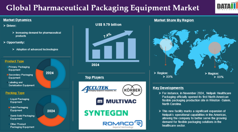 さらに、業界の主要企業による合併・買収や投資、事業拡大といった戦略が、この医薬品包装機器市場を牽引することになるでしょう。例えば、2024年9月に開催された「PackEx India」において、Syntegonは食品および医薬品分野における効率性の向上と環境負荷の低減を目的とした、革新的かつ持続可能な一連の包装ソリューションを発表しました。この取り組みは、自動化、持続可能性、包括的な包装システムに対する需要の高まりなど、現在の市場動向に対応するという同社の姿勢を反映しています。