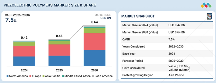 圧電ポリマー市場は、2025年の4億5,000万米ドルから、2030年までに6億4,000万米ドルへと、年平均成長率(CAGR)7.5%で拡大すると予想されています。この成長の主な要因としては、医療機器、センサー、アクチュエータ、エネルギーハーベスティングシステムにおける軽量で柔軟性があり、エネルギー効率の高い部品への需要の高まりに加え、ウェアラブル電子機器の製造および利用の増加が挙げられます。従来のセラミック系圧電材料と比較して、圧電ポリマーは機械的な柔軟性が高く、密度が低く、加工が容易であるため、小型で高度に集積化された「スマート」デバイスへの使用に最適です。アジア太平洋地域におけるエレクトロニクス需要の拡大、および北米や欧州での継続的なイノベーションが、圧電ポリマーの採用をさらに後押しするでしょう。