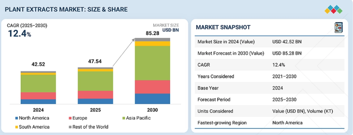 植物抽出物市場は、2025年の475億4000万米ドルから2030年までに852億8000万米ドルに達すると予測されており、2025年から2030年までの年間平均成長率(CAGR)は12.4%となる見込みです。この市場の成長は、天然成分やクリーンラベル製品への需要増加、ならびに栄養補助食品やハーブサプリメント市場の拡大によって牽引されています。
