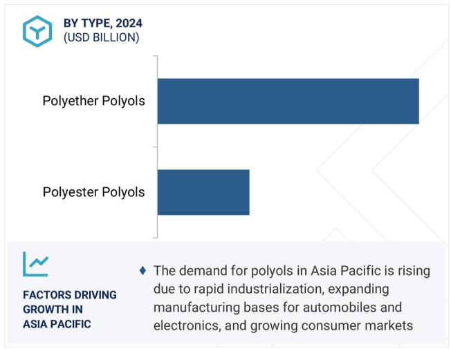 アジア太平洋地域は、急速な工業化、製造能力の向上、主要な最終用途分野での需要増加を背景に、予測期間中ポリオール市場で最大のシェアを占めると予想されます。中国、インド、韓国、東南アジア諸国などの国々では、ポリオールを使用したポリウレタン製品の主要な消費者である建設、自動車、エレクトロニクス、包装、消費財の分野で積極的な成長が見られます。
