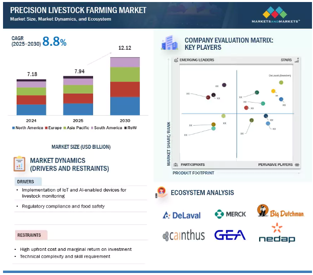精密畜産市場は、予測期間中の年平均成長率8.8%で、2025年の79億4,000万米ドルから2030年には112億2,000万米ドルに拡大すると予測されています。自動化、センサー技術、IoT、データ分析の進歩により、家畜管理におけるリアルタイムモニタリングとデータ主導の意思決定が可能になり、市場は急速に進化しています。ロボット搾乳、給餌システム、ウェアラブル健康機器の採用は、労働効率を高め、動物福祉を改善し、病気の早期発見を可能にします。これらの技術はまた、資源利用の最適化、廃棄物の削減、全体的な生産性の向上により、持続可能な農業を支援します。センサー、アナリティクス、自動化システムにおける継続的な技術革新は、政府の支援策と相まって、酪農場、養鶏場、養豚場全体での採用を加速させ、従来の家畜管理をより効率的で持続可能な、福祉に重点を置いた慣行へと変化させています。