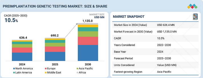 着床前遺伝子検査市場は、2025年の6億9,020万米ドルから2030年までに11億3,500万米ドルに達すると予測されており、2025年から2030年までの年間平均成長率(CAGR)は10.5%となる見込みです。胚移植前遺伝子検査市場の成長は、世界的な出生率の低下や、整倍体単一胚移植(SET)を推奨する臨床医のガイダンスなど、複数の要因によって牽引されている。