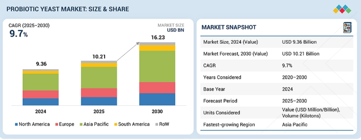 プロバイオティクス酵母市場は2025年に102億1000万米ドルと推定され、2030年までに162億3000万米ドルに達し、CAGR9.7%で成長すると予測されている。市場は急成長を遂げており、その主な要因は、食品・飲料、栄養補助食品、医薬品、動物栄養分野における機能性食品、予防医療、消化器健康ソリューションの幅広い拡大である。酵母ベースのプロバイオティクスは主にサッカロマイセス・セレビシエ(Saccharomyces cerevisiae)およびサッカロマイセス・ブールアルディ(Saccharomyces boulardii)から生産される変異体であり、その耐久性、抗生物質耐性、ならびにヒトおよび動物対象への適合性と重要性から、次第に主要な商業的プレイヤーとなりつつある。