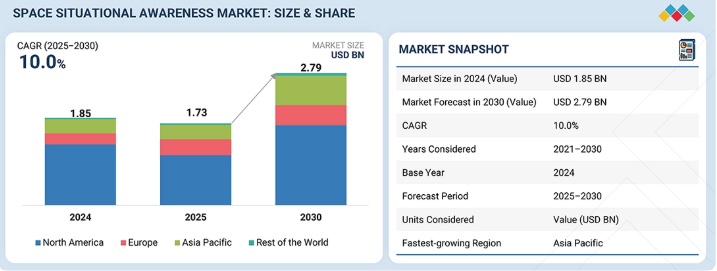 宇宙状況認識市場は、2025年の17億3,000万米ドルから2030年までに27億9,000万米ドルへと、年平均成長率(CAGR)10.0%で拡大すると予測されています。この成長は、衛星の打ち上げ数と軌道上の混雑が急速に増加していることに起因しており、これにより事業者や政府は、継続的な追跡、衝突回避、および宇宙交通管理機能への投資を余儀なくされています。