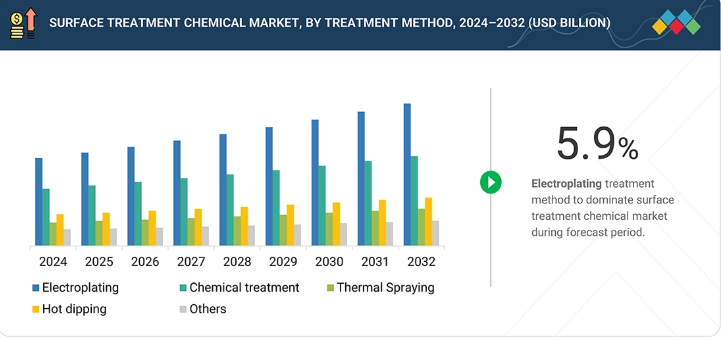 表面処理薬品市場において溶融めっきが第3位のシェアを占めているのは、特に鋼鉄や鉄の基材に対して長期的な腐食防止効果を発揮するためです。溶融亜鉛めっきで広く知られるこのプロセスは、亜鉛との強固な冶金的結合を形成し、構造物や部品のライフサイクルにわたって耐久性を大幅に高め、メンテナンスコストを削減します。