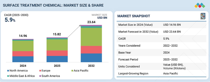 表面処理薬品市場は、2025年の158.2億米ドルから2032年には236.4億米ドルに達すると予測され、2025年から2032年までの年平均成長率は5.9%です。この成長の主な要因は、表面処理ソリューションが進化する業界標準に沿って自動車の耐久性、性能、持続可能性を強化する自動車セクターからの需要の増加によるものです。