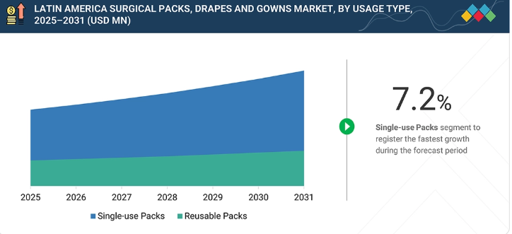 ラテンアメリカ地域における手術用パック、ドレープ、ガウン市場への影響は、需要と治療トレンドに直接関連しています。手術用ガウン・ドレープメーカーの主要エンドユーザーには、病院、外来手術センターなどが含まれる。治療トレンドの変化、より先進的な技術・製品の受容、あるいはこれらの製品の流通・使用方法の変化も、エンドユーザー業界の需要水準に影響を与える。これは最終的に、手術用パック、ドレープ、ガウンメーカーの売上創出に影響を及ぼす。