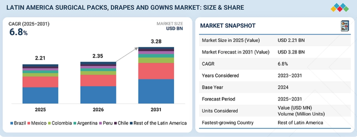 ラテンアメリカにおける外科用パック、ドレープ、ガウン市場は、2025年に22億1,000万米ドルと評価され、2026年には23億5,000万米ドルに達した。2026年から2031年にかけては6.8%という堅調なCAGRで成長し、期間末には32億8,000万米ドルに達すると予測されている。市場成長と拡大に寄与する要因としては、医療関連感染(HAI)の発生率増加、外科手術件数の増加、感染管理ソリューションにおける継続的な研究開発と革新が挙げられる。外科用滅菌・消毒ソリューションへの需要増加や、手術用パック・ドレープ・ガウン材料の製造技術革新も市場成長を後押ししている。しかしながら、手術用パック・ドレープ・ガウンの高コスト、環境への影響および廃棄物問題が市場の障壁となっている。一方で、使い捨て手術ソリューションへの選好の高まり、患者安全、環境に優しい素材の革新といった面で市場機会が存在する。