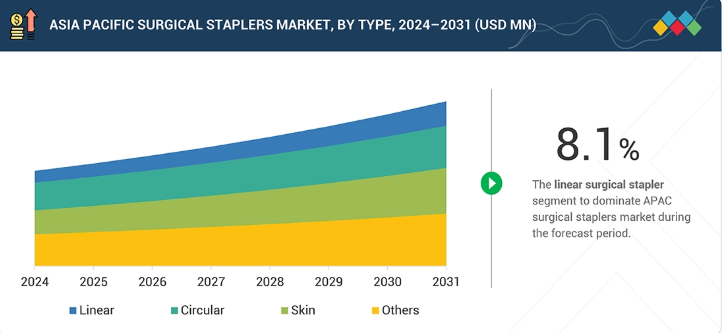 アジア太平洋外科用ステープラー市場、タイプ別(金額 – 百万米ドル、数量 – 千単位)、2024–2031年