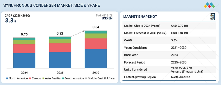 同期コンデンサ市場は、2025年の0.72億米ドルから、予測期間中に年平均成長率(CAGR)3.3%で拡大し、2030年には0.84億米ドルに達すると予測されています。同期コンデンサ市場は、送電網の信頼性を高めるための電力インフラへの投資増加により成長しています。