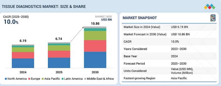 世界の組織診断市場は、2024年に61億9,000万米ドルと評価され、2025年には67億4,000万米ドルに達しました。2025年から2030年にかけては堅調な年平均成長率(CAGR)10.0%で拡大し、期間終了時には108億6,000万米ドルに達すると予測されています。市場成長の背景には、がん発生率の上昇とデジタル病理学への需要拡大があり、これらがより正確で高スループットな組織ベース診断の必要性を促進しています。加えて、医療費支出の増加と償還制度の拡充により先進診断技術へのアクセスが拡大し、民間診断センターの増加が標準化・自動化された検査ワークフローの導入を支えています。これらの要因が相まって、組織診断の需要が高まり、疾患の早期発見が促進され、医療システム全体における患者管理の質が向上しています。
