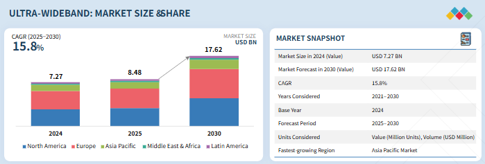 ウルトラワイドバンド市場は、2025年の84.8億米ドルから2030年には176.2億米ドルに成長し、2025年から2030年までの年平均成長率は15.8%と予測されています。ワイヤレスワイドバンド通信システムの需要は、モバイルアドホックネットワーキングやワイヤレスセンサーネットワークを介したデータ収集などの新たなアプリケーションの登場により大幅に増加しています。UWB技術をベースとしたRTLSソリューションは、主に産業資産、マテリアルフロー、従業員の位置を正確かつリアルタイムに追跡するためにさまざまな産業で使用されているため、UWB市場のRTLSアプリケーションセグメントは長年にわたって成長を遂げています。
