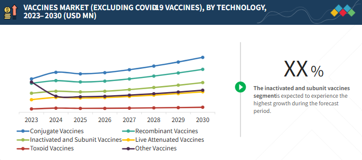 様々なワクチン技術(COVID-19ワクチンを除く)のうち、結合型ワクチン、不活化・サブユニットワクチン、弱毒生ワクチン、組み換えワクチン、トキソイドワクチンがあります。結合型ワクチン市場の大部分は、これらのワクチン開発を目的とした政府支援の拡大と官民パートナーシップの増加によるものです。