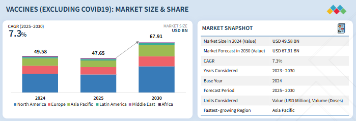 世界のワクチン市場は、2025年の4,765万米ドルから2030年には6,791万米ドルに達すると予測され、予測期間の年平均成長率は7.3%です。この市場は、ワクチンの急速な開発と世界的な商業化、予防のためにワクチン接種を必要とする感染症の流行の増加、予防接種プログラムの数の増加、ワクチン開発をサポートする技術の進歩、さまざまな疾患の適応症のための新しいワクチンの作成を目的とした投資や資金提供による政府支援の増加など、いくつかの要因によって成長しています。