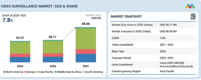 ビデオ監視市場は、2025年の561億1000万米ドルから2031年までに880億6000万米ドルに達すると予測されており、2025年から2031年までの年間平均成長率(CAGR)は7.8%となる見込みです。クラウドベースの監視技術とエッジコンピューティングの進歩が市場成長を加速させています。